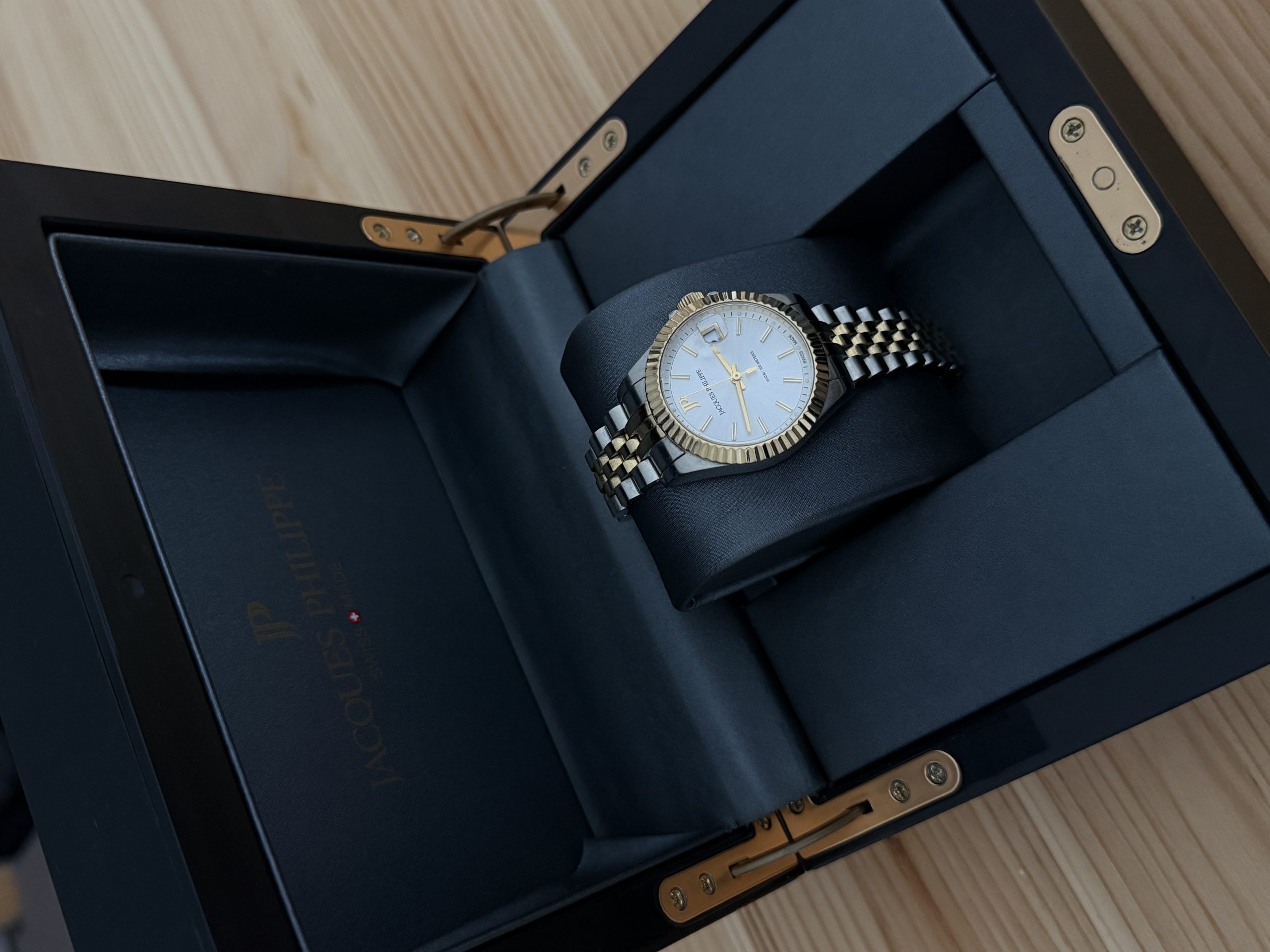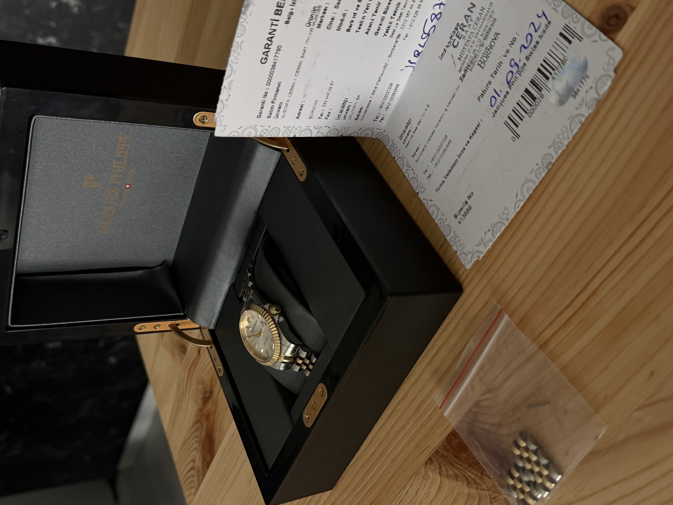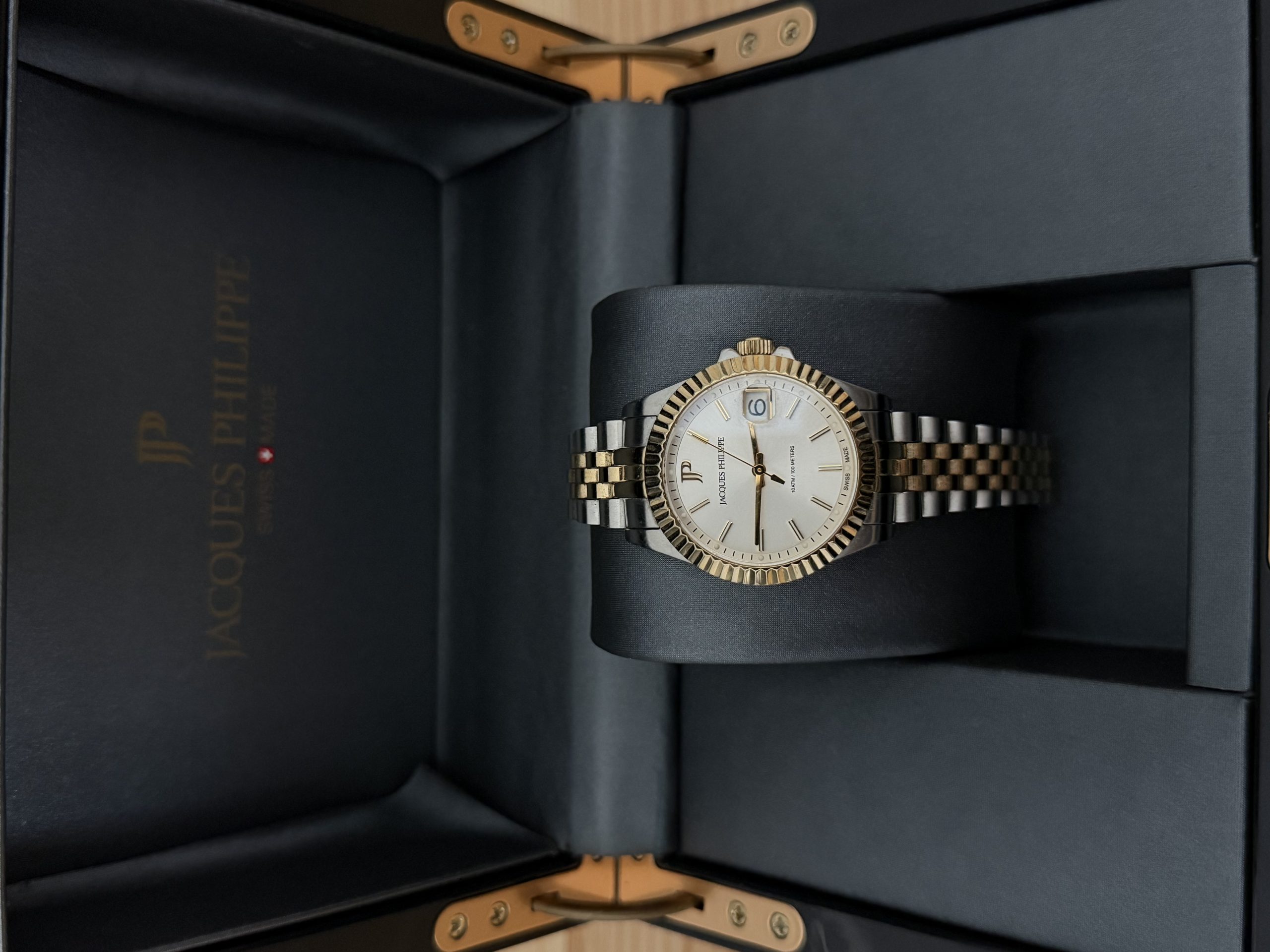 Jacques Philippe marka, safir camlı, quartz mekanizmalı, gümüş ve altın detaylı kadın kol saati. Şık tasarımı ve zarif kadranıyla dikkat çekmektedir. Garantisi 01/09/2026 tarihine kadar devam etmektedir. Sadece 5 ay kadar, haftada birkaç defa kullanıldı. Uzun süredir kullanılmadığı için satıyorum. Herhangi bir arızası ve kusuru yoktur. Eksik parçası yoktur. Tüm baklaları tamdır. Garanti belgesi fotoğraflarda mevcuttur.