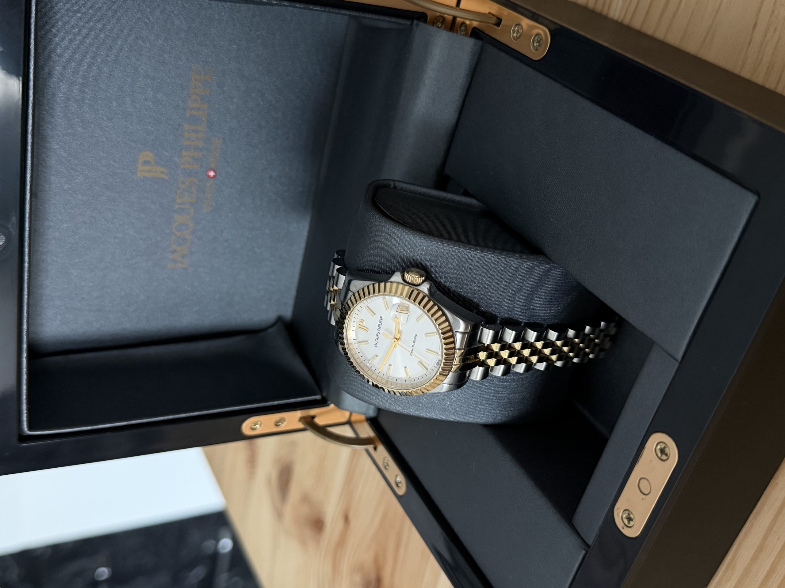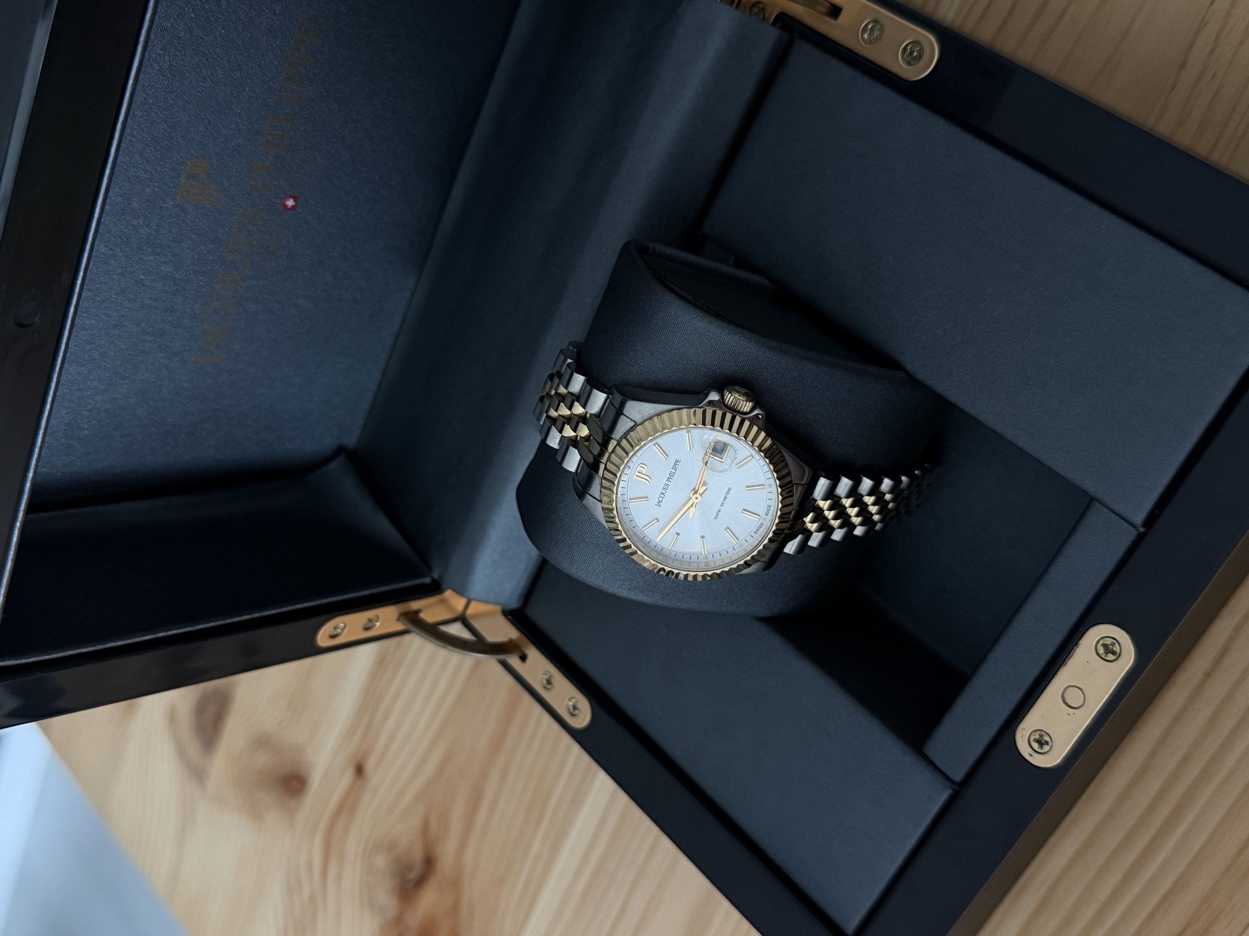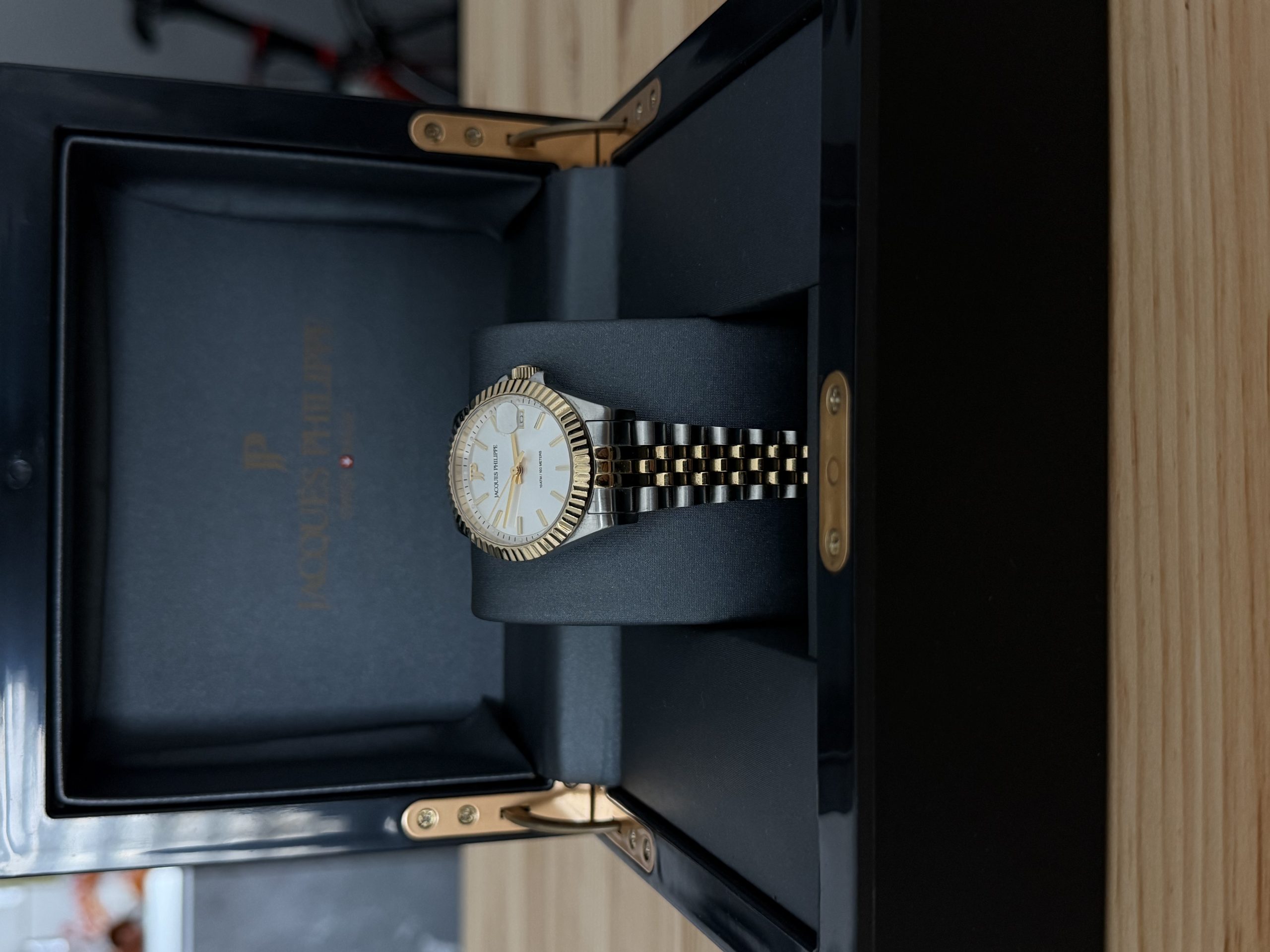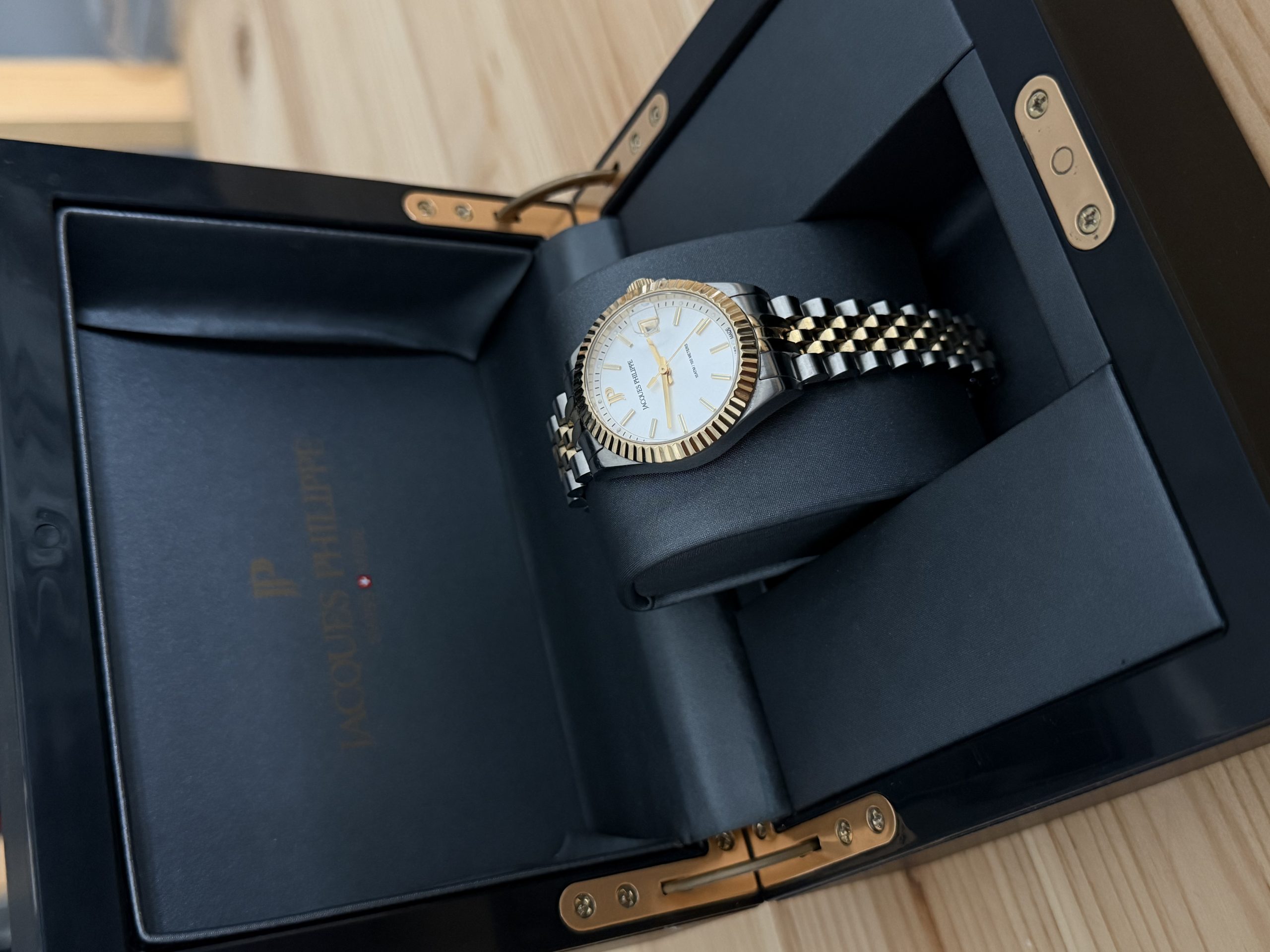 Jacques Philippe marka, safir camlı, quartz mekanizmalı, gümüş ve altın detaylı kadın kol saati. Şık tasarımı ve zarif kadranıyla dikkat çekmektedir. Garantisi 01/09/2026 tarihine kadar devam etmektedir. Sadece 5 ay kadar, haftada birkaç defa kullanıldı. Uzun süredir kullanılmadığı için satıyorum. Herhangi bir arızası ve kusuru yoktur. Eksik parçası yoktur. Tüm baklaları tamdır. Garanti belgesi fotoğraflarda mevcuttur.