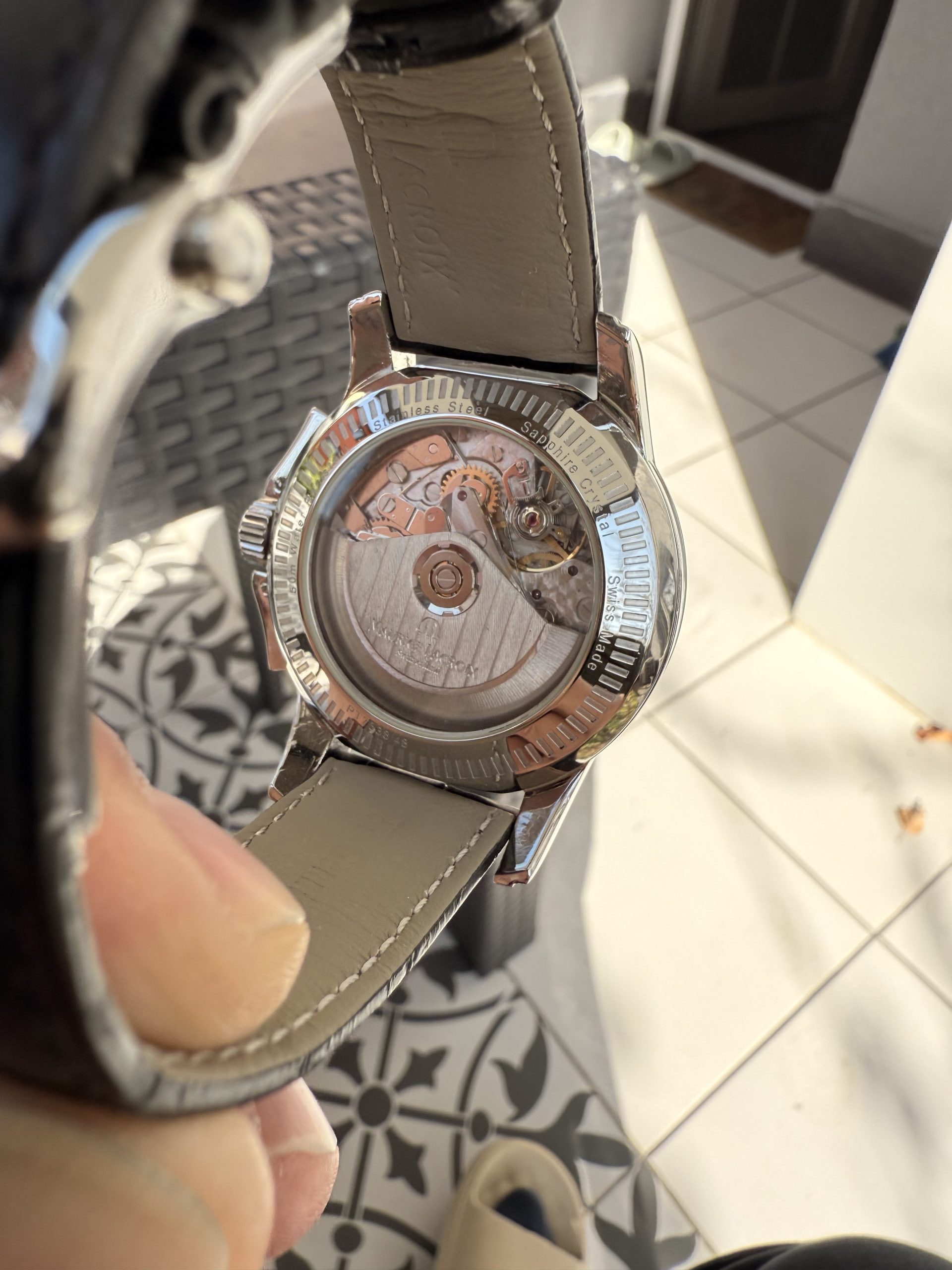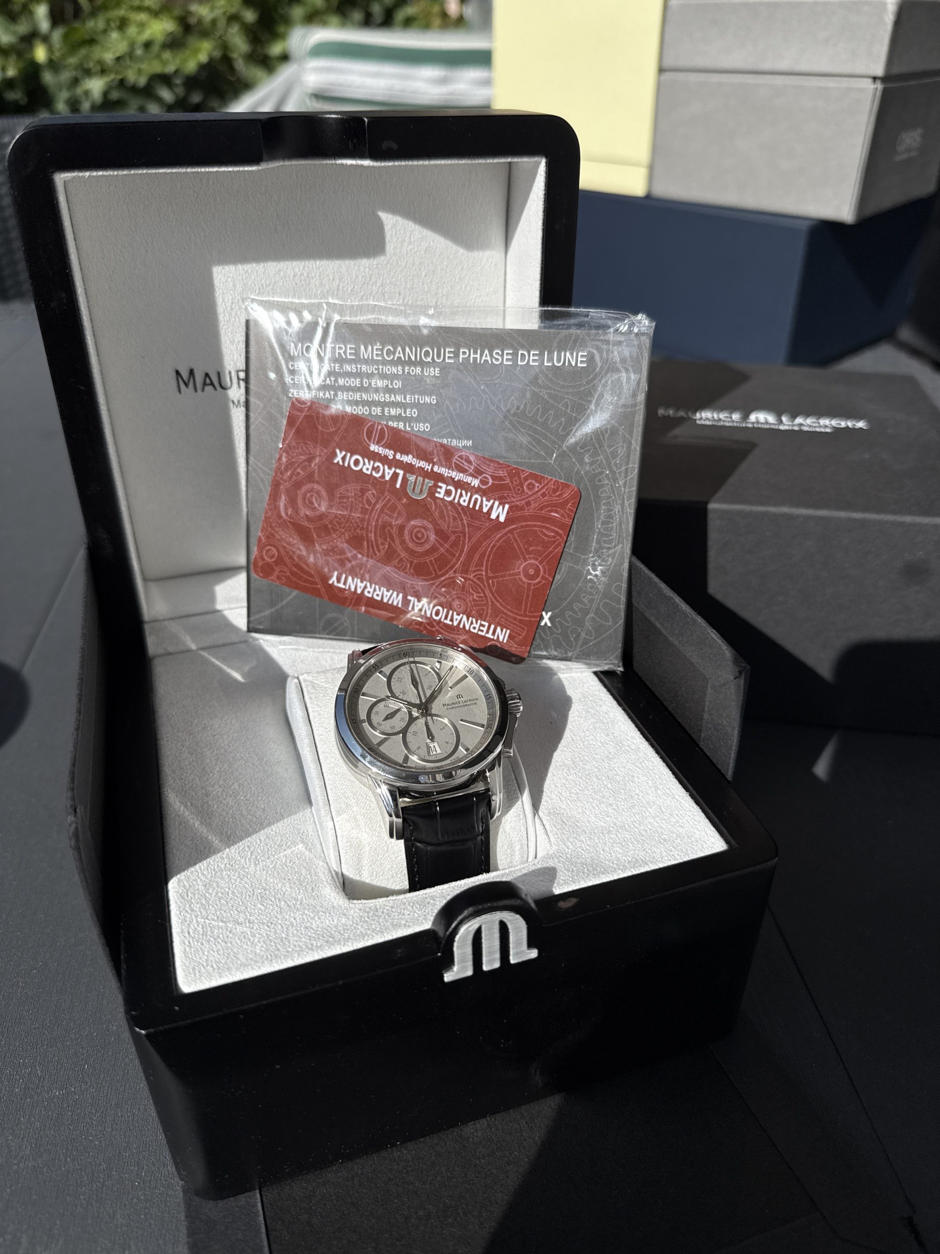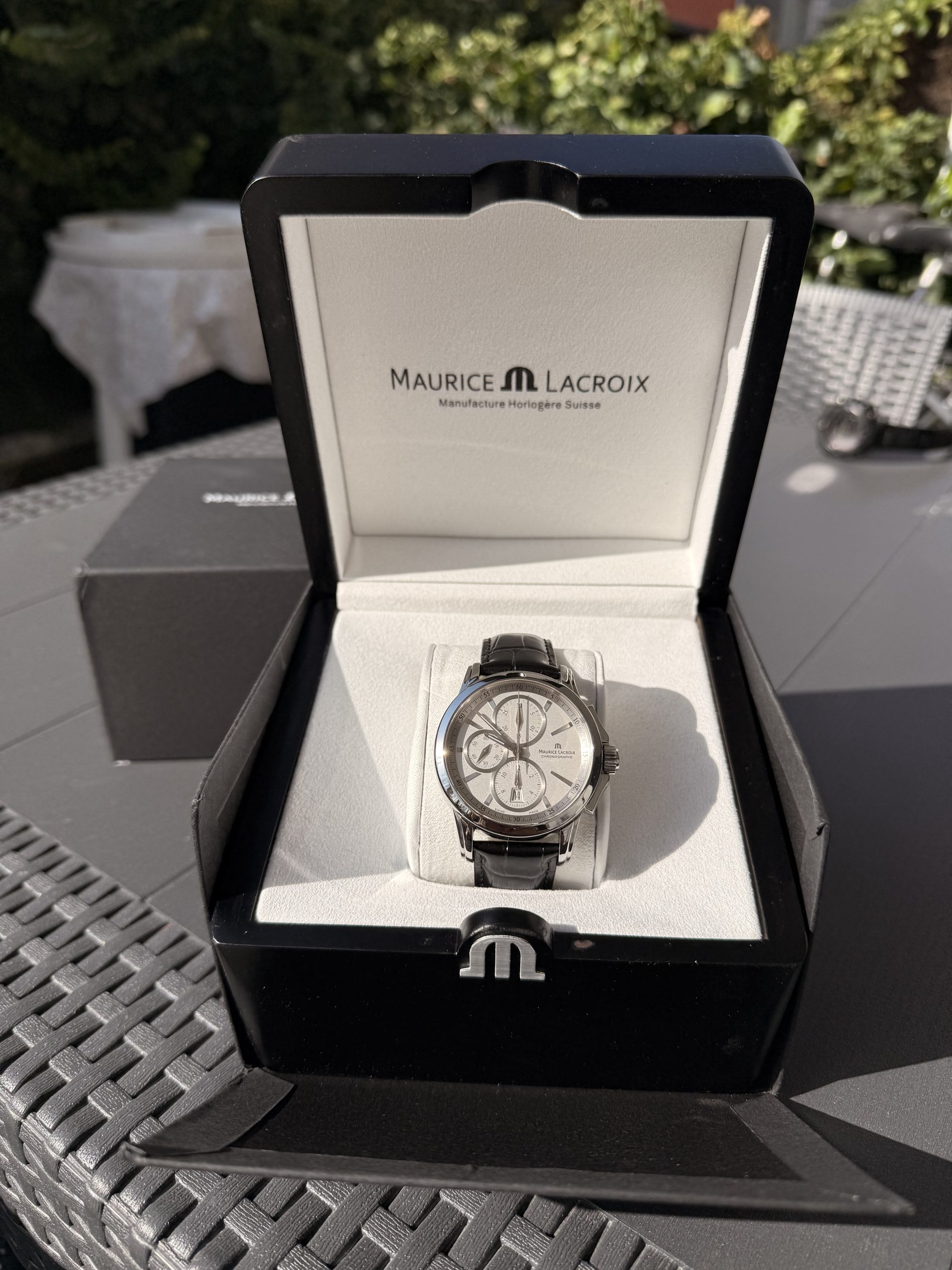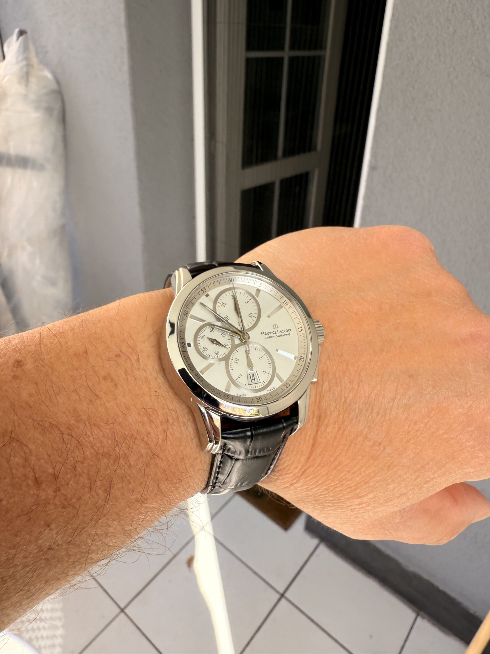 Saat sıfır ve ful set. Hiç kullanılmadı. Automatic Chronograph date.Safir kristal cam. Siyah deri kordon. Deployant çelik toka.