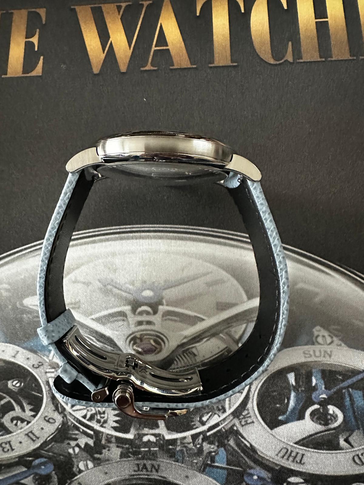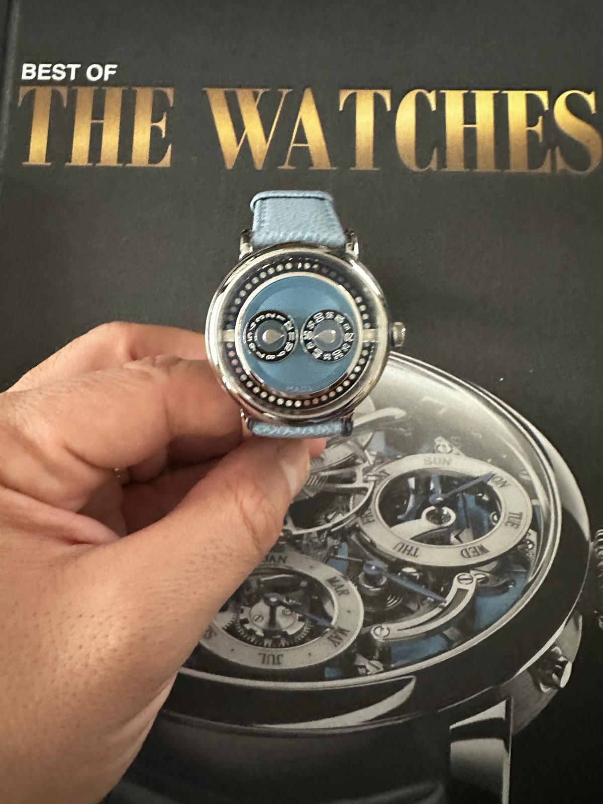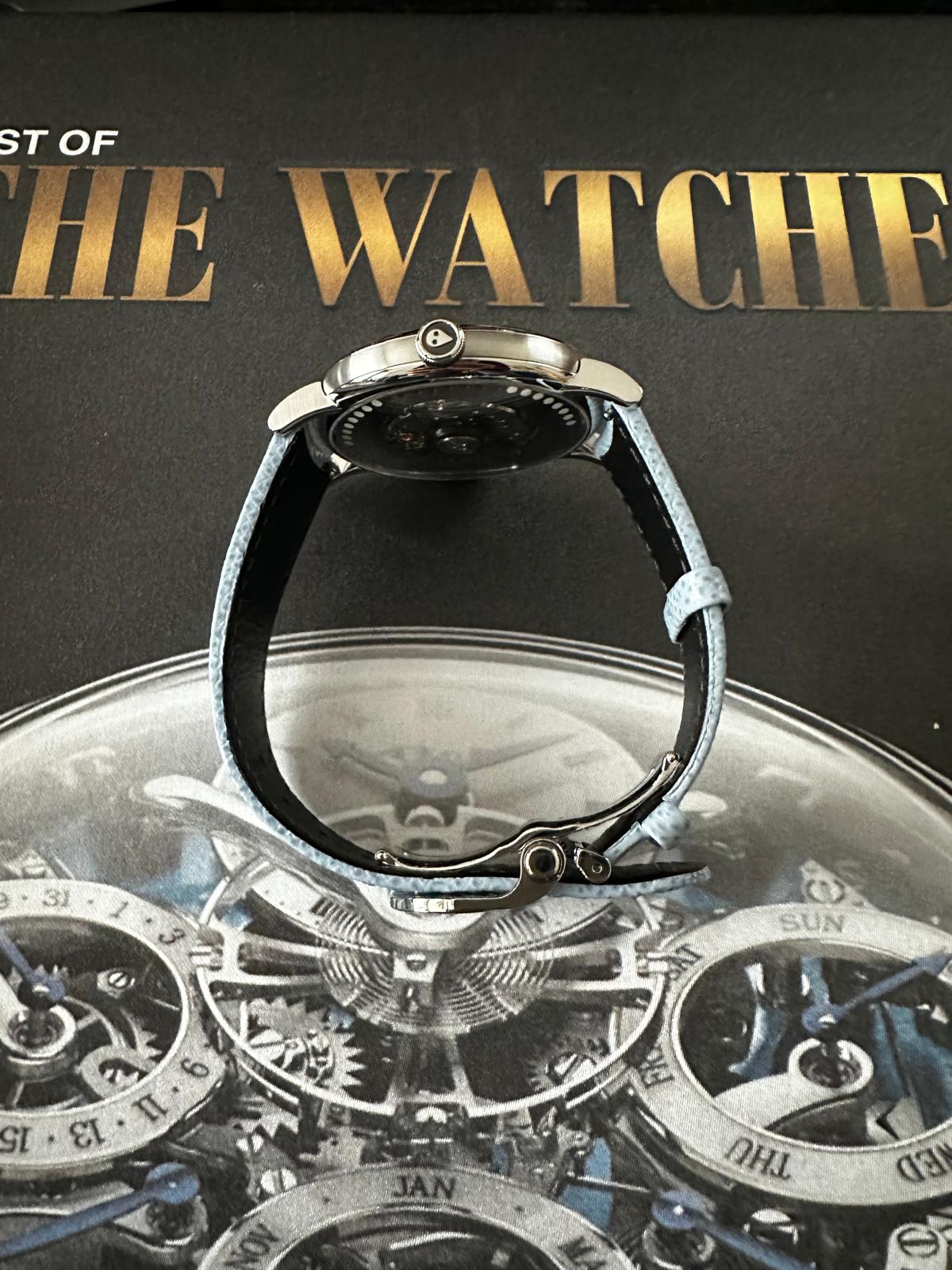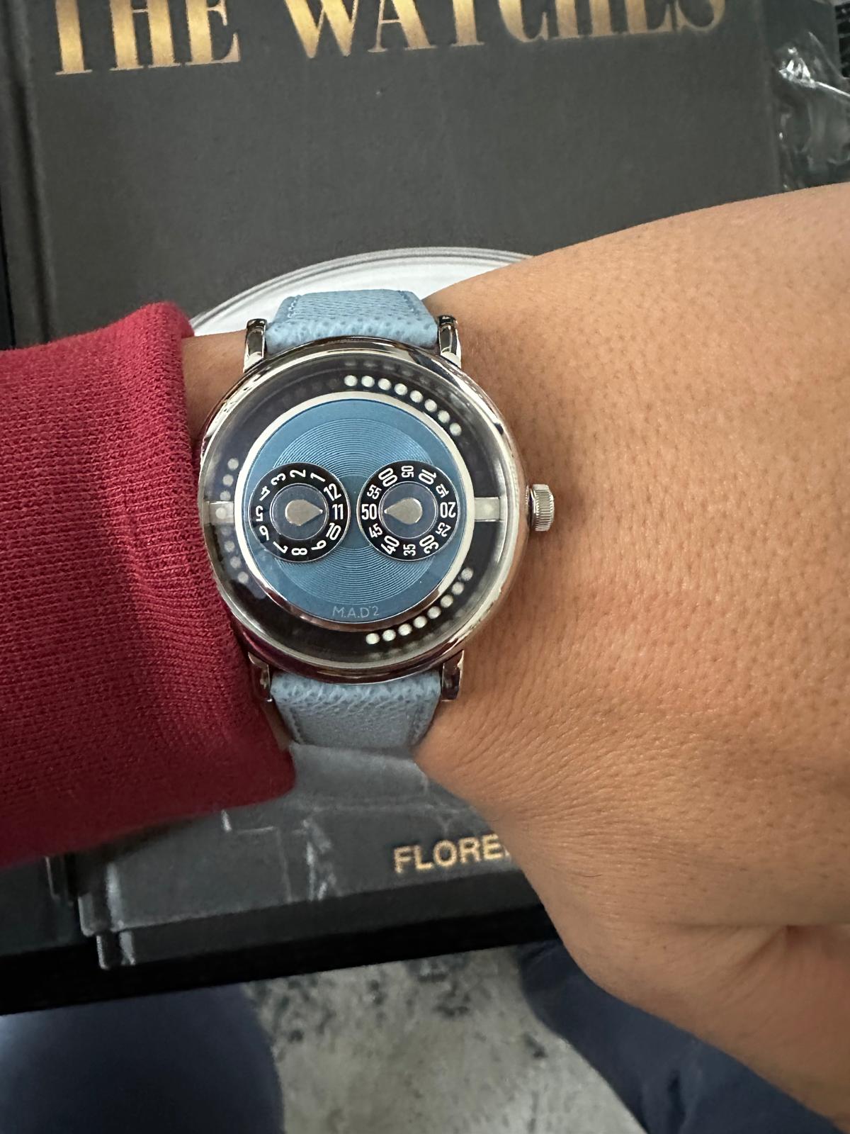 MB&F M.A.D.Editions M.A.D.2 “World Tour” Limited Blue – Full Set – Sıfır Koleksiyoner gözüyle bakıldığında M.A.D.2 “World Tour” Limited Blue, MB&F’in M.A.D.Editions çizgisinde en güçlü “karakter” taşıyan renk varyantlarından biri. DJ kültürüne referans veren turntable/plate estetiği, bilekte hareket ettikçe “yaşayan” rotor kurgusu ve M.A.D.2’nin merkezdeki jumping hour + trailing minutes mimarisiyle, klasik saat algısını bilinçli şekilde kıran bir parça. World Tour Blue hakkında: Bu edisyon, MB&F’in global retail partnerleri üzerinden çok sınırlı adetlerle sunulan “World Tour” konseptinin mavi yorumu olarak konumlanıyor Teknik Bilgiler Kasa: 316L paslanmaz çelik, 42 mm çap / 12.3 mm yükseklik, lug-to-lug 48.5 mm, lug 21 mm Cam: Üst/alt safir, AR kaplamalı Su geçirmezlik: 30 m / 3 ATM Mekanizma: La Joux-Perret G101 otomatik + MB&F geliştirmesi bi-directional jumping hour & trailing minutes modülü Frekans / Power reserve: 4Hz (28,800 vph) / 64 saat Kayış/Toka: Deri kayış + paslanmaz çelik katlanır toka
