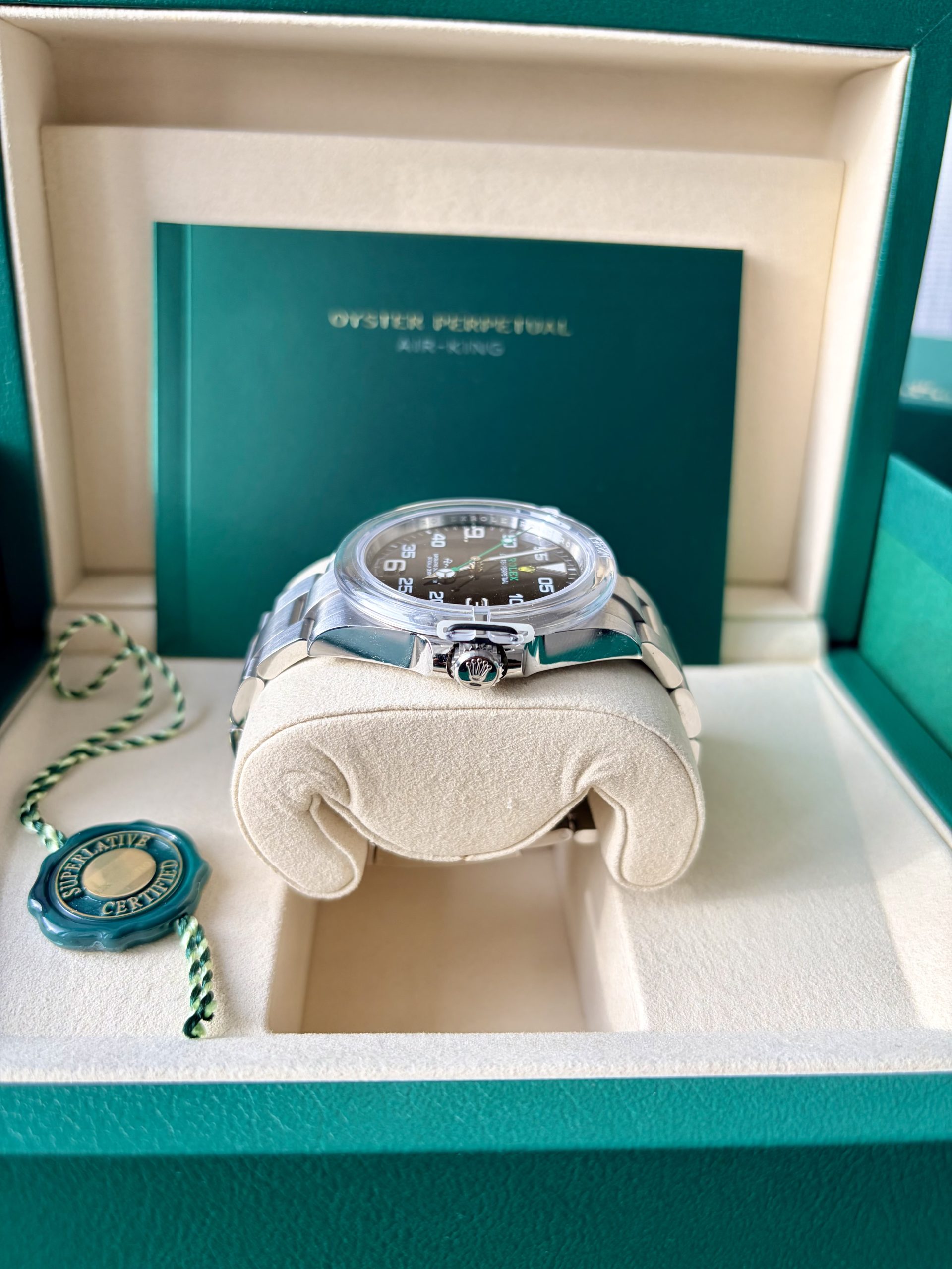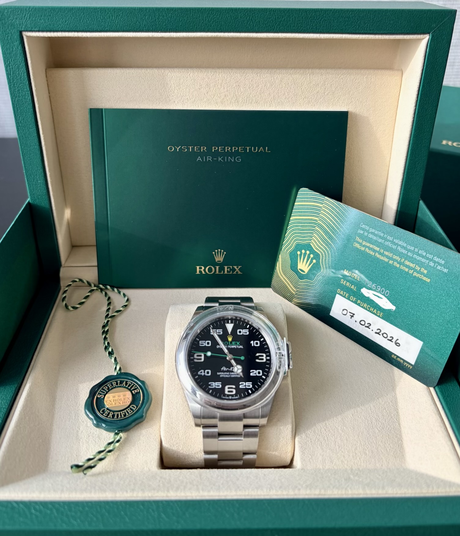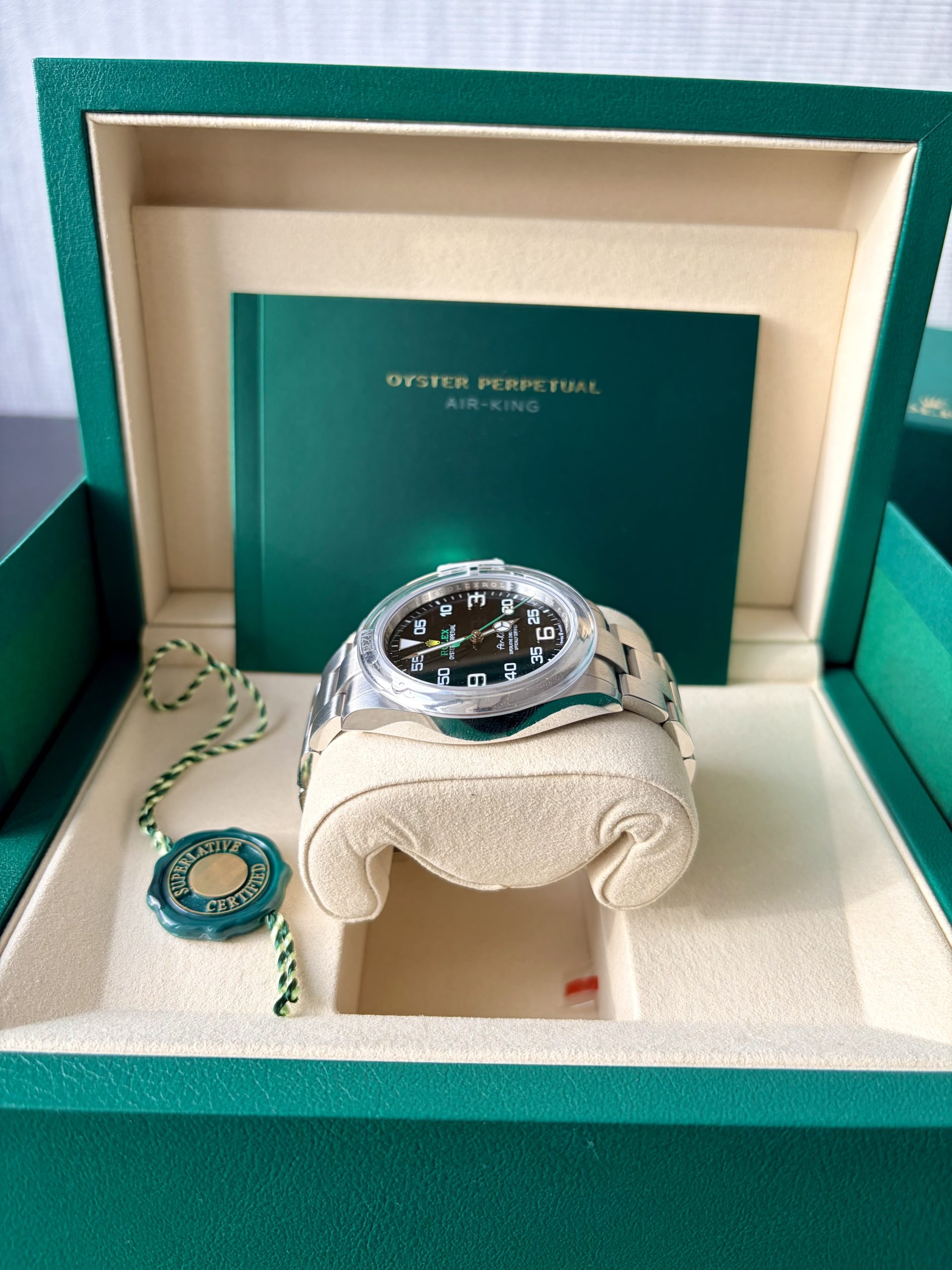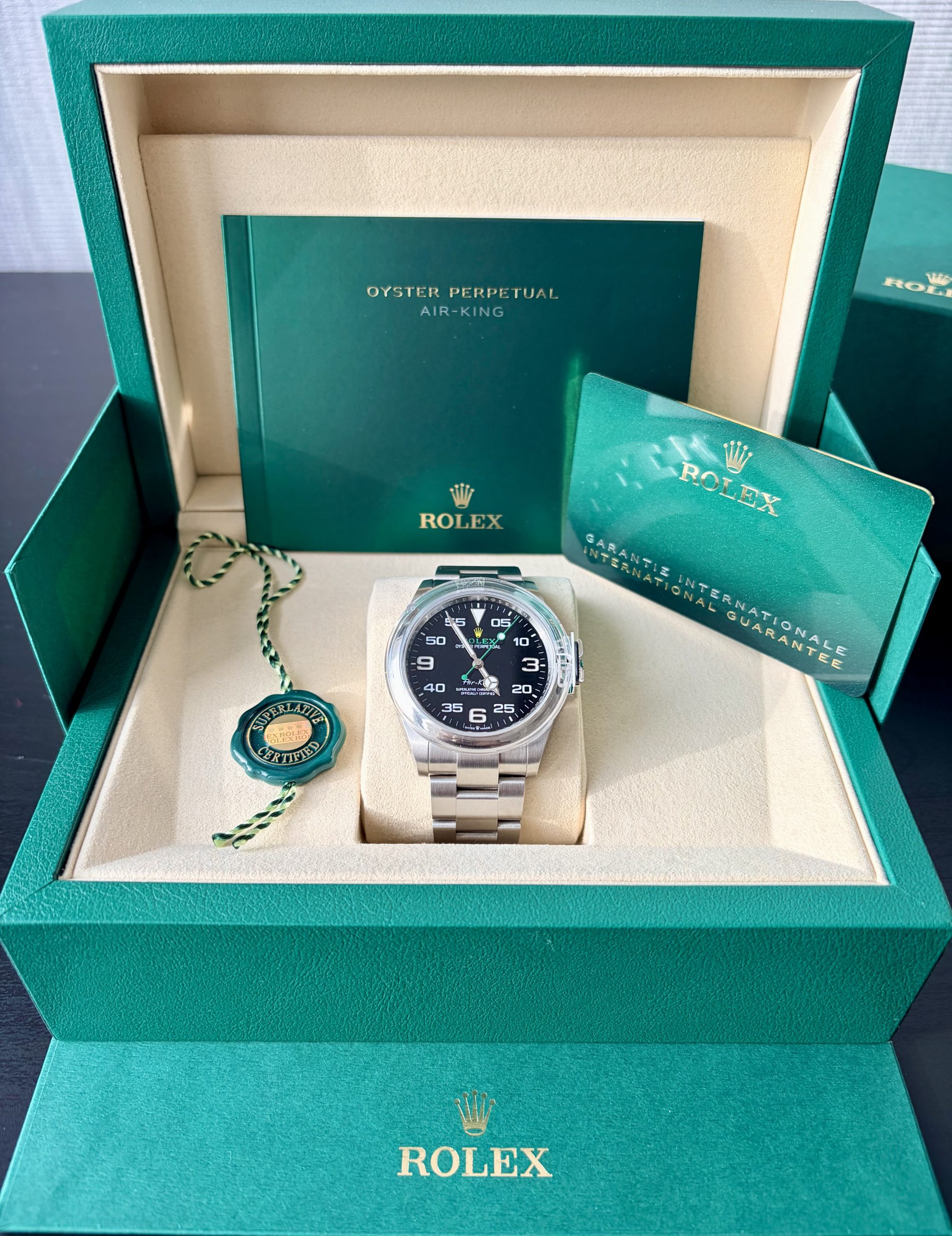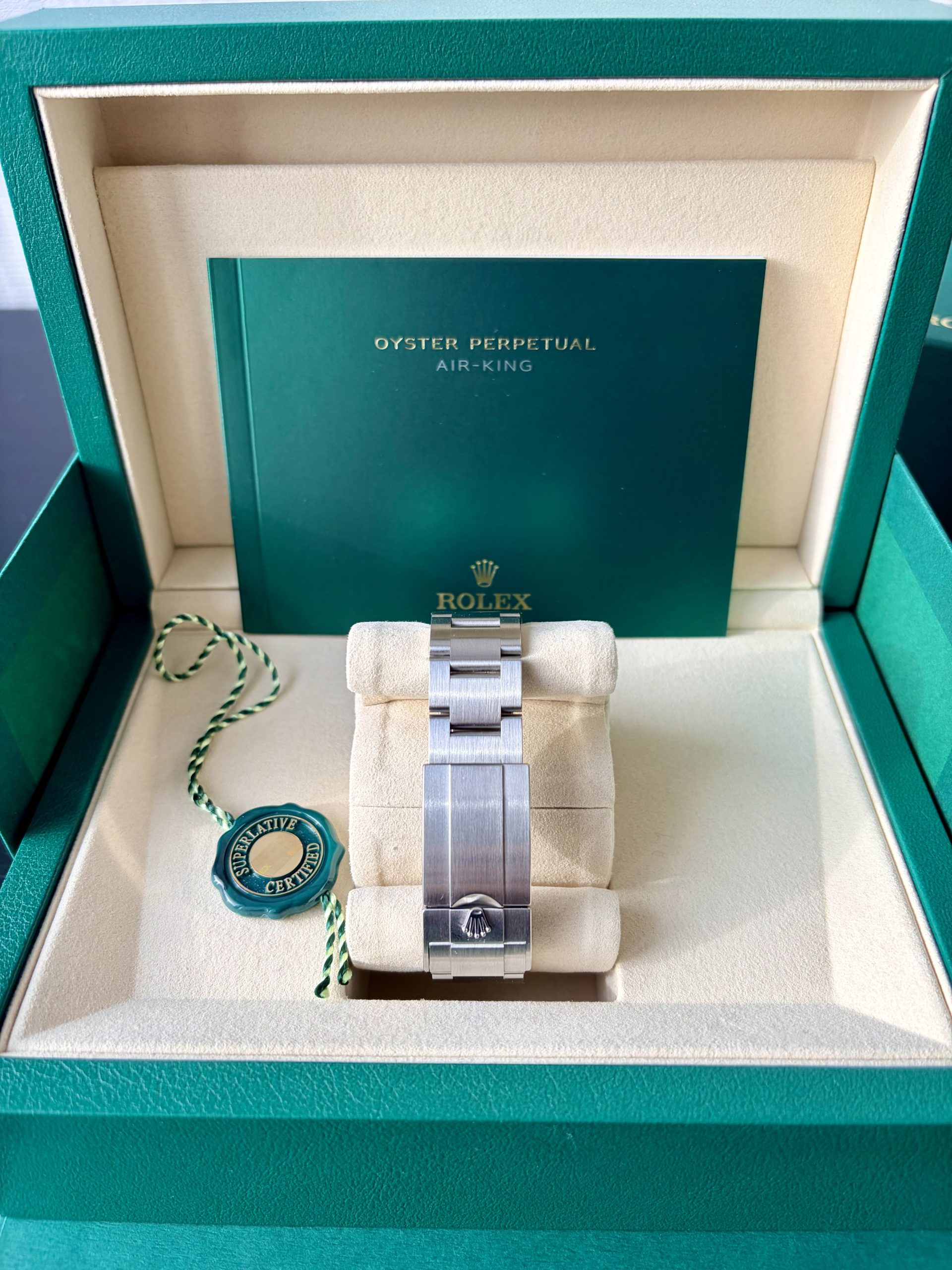 2026 Şubat ayı bayii çıkışlı. Full set. Kutu Sertifika Yeşil tag Bezel Koruma ref 126900 Air-King, Rolex saat ailesine 1958 yılında katıldı. Kadranda yer alan ismi, dikkat çekici italik bir yazı karakteriyle yazılmıştı: Rolex için bir ilk. O tarihte Hans Wilsdorf tarafından bizzat seçilen bu imza, bugün hâlâ değişmeden korunuyor.