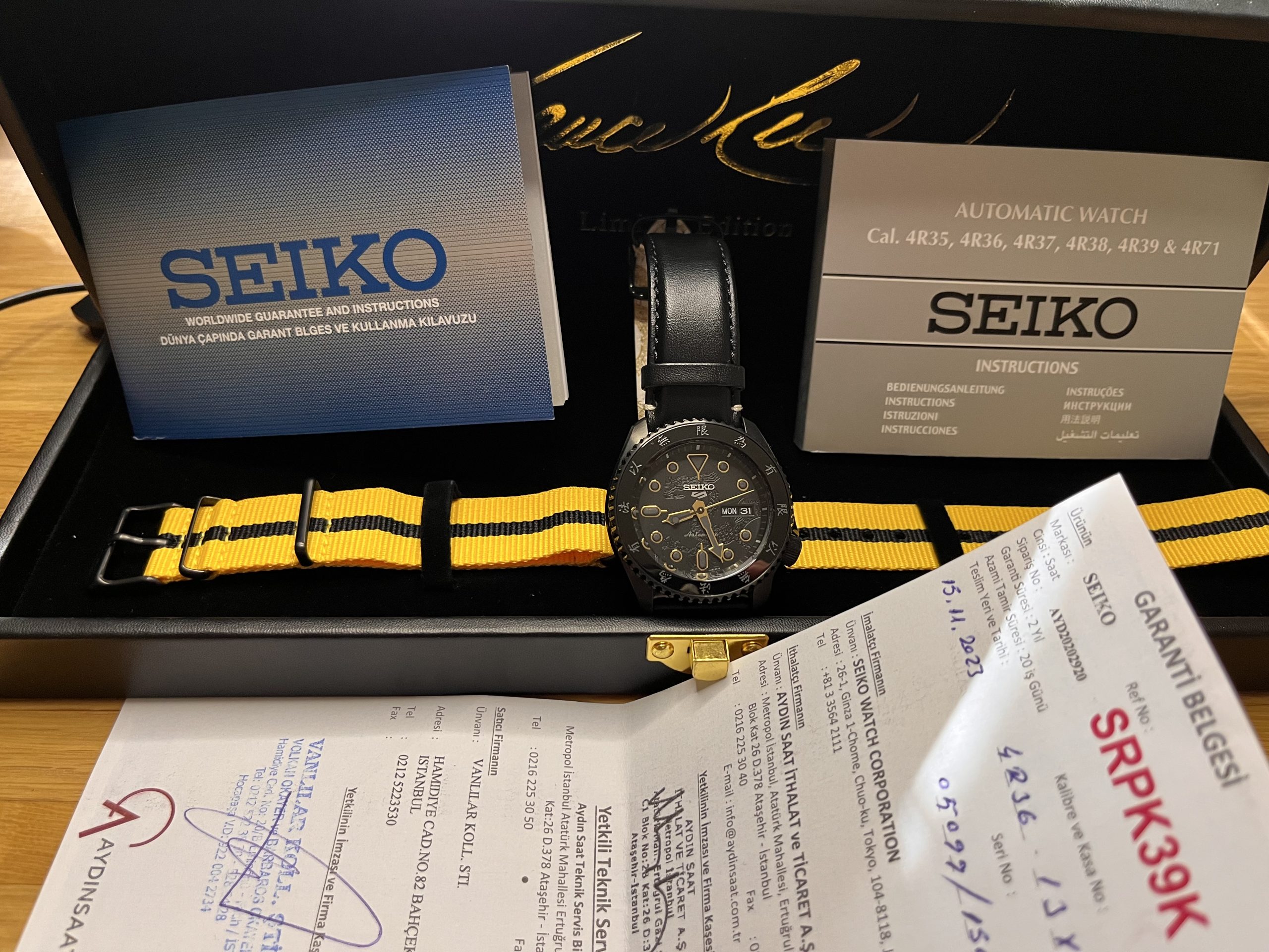 Bruce Lee Special Edition Limited 5099/15000. 100m su geçirmezlik. 4R36 mekanizma. Özel yedek kayışı ile birlikte özel kutusunda. Camında çizik, kasasında hasar yoktur.